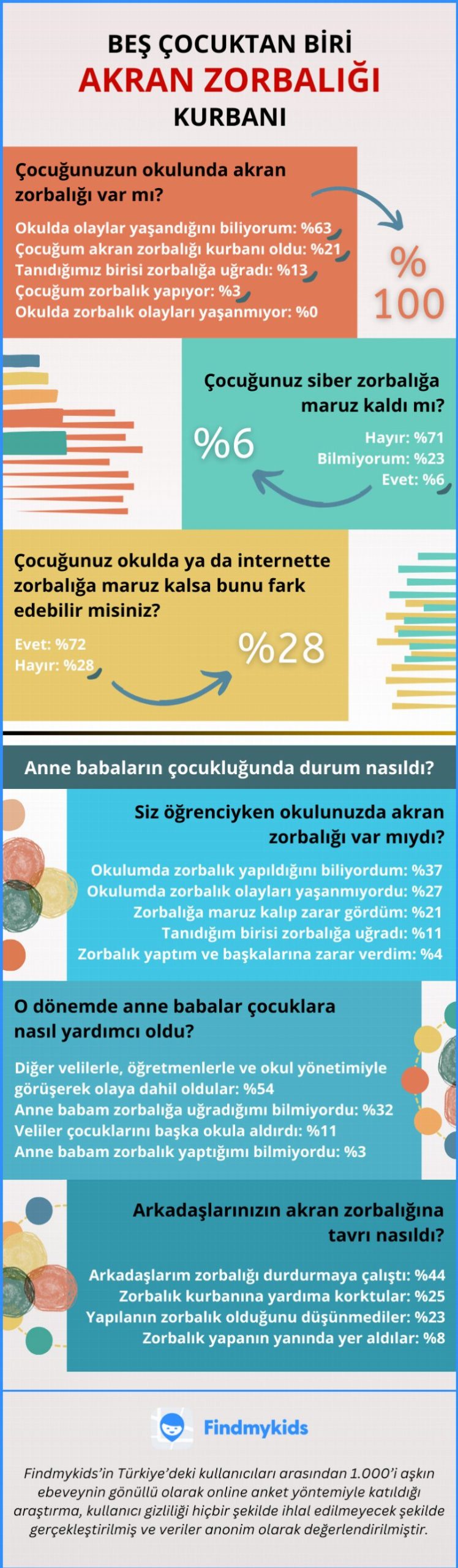 Findmykids’in araştırmasına katılan anne babaların yaklaşık yüzde 21’i çocuklarının okulda akran zorbalığının kurbanı olduğunu belirtiyor. “Çocuğumun başına gelmedi ama okulda bu tür olaylar yaşandığını biliyorum” diyen ebeveynlerin oranı yüzde 63 iken, tanıdığı birisinin zorbalığa uğradığını belirtenlerin oranı yüzde 13 oldu. Yüzde 3’lük bir kesim ise kendi çocuğunun zorbalık yaptığı düşüncesinde.