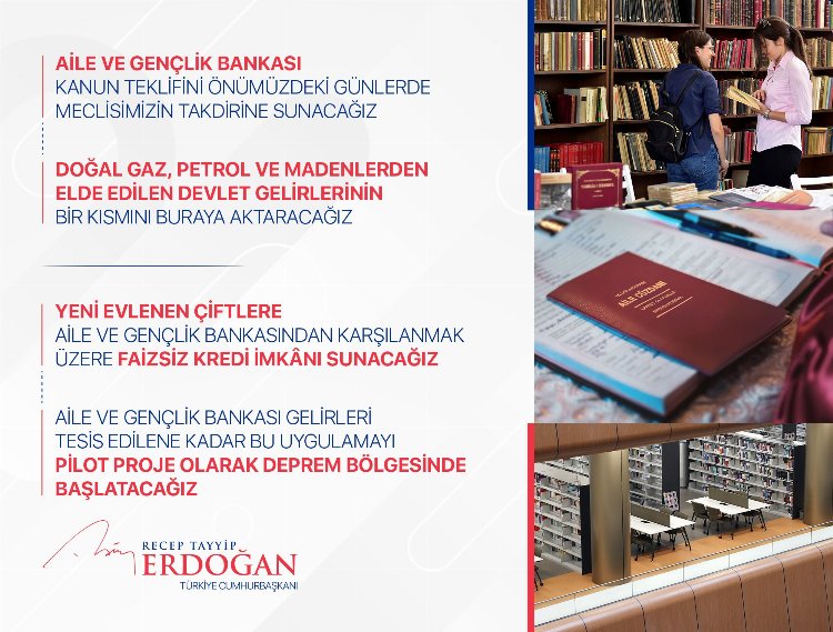 Evlenecek gençlerin ekonomik açıdan desteklenmesini, evliliklerinin daha sağlam temeller üzerine inşa edilmesini amaçlayan projemizin hazırlıklarını tamamladıklarını belirten Cumhurbaşkanı Erdoğan, Aile ve Gençlik Bankası gelirleri tesis edilene kadar bu uygulamayı pilot proje olarak deprem bölgesinde başlatacaklarını söyledi.