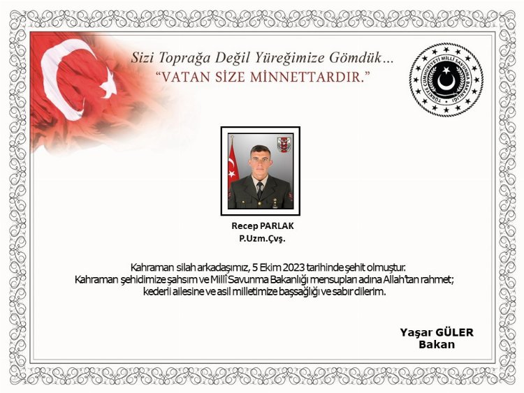 MSB tarafından yapılan paylaşımda, “Pençe-Kilit operasyonu bölgesinde, 30 Eylül 2023 tarihinde, teröristlerce yapılan taciz atışı sonucunda yaralanarak hastaneye sevk edilen kahraman silah arkadaşımız P. Uzm. Çvş Recep Parlak, tedavi gördüğü hastanede yapılan tüm müdahalelere rağmen kurtarılamayarak 05 Ekim 2023 tarihinde şehit olmuştur. Bizleri derin bir acı ve üzüntüye boğan bu olayda hayatını kaybeden aziz şehidimize Allah’tan rahmet, kederli ailesine, Türk Silahlı Kuvvetleri ile asil milletimize başsağlığı ve sabır dileriz.” ifadelerine yer verildi.