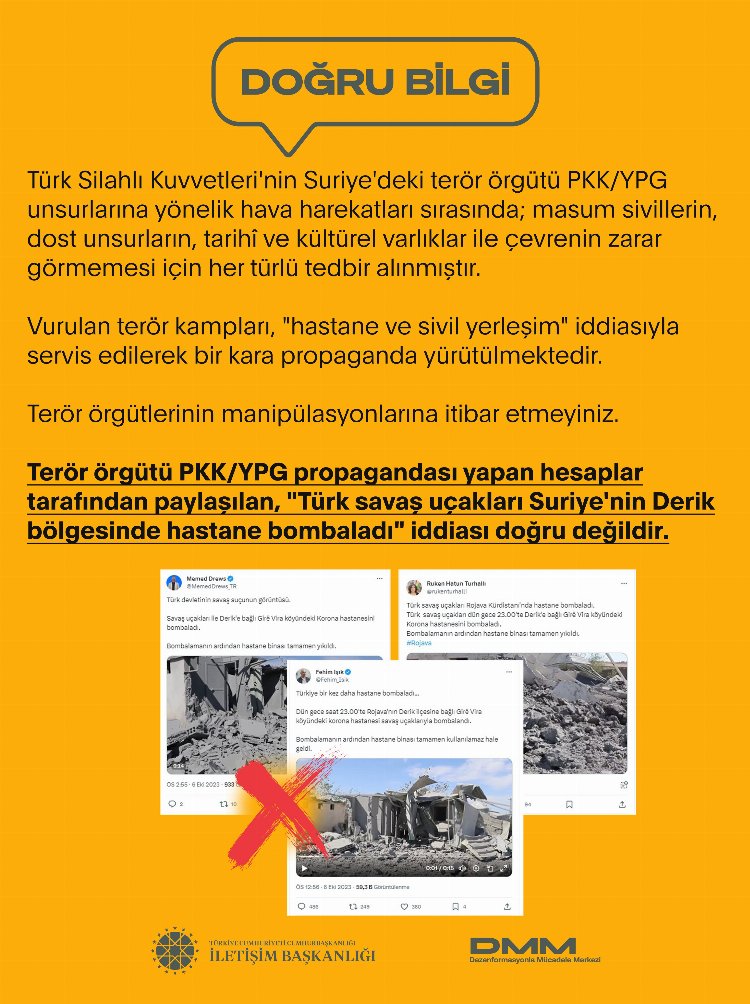 İletişim Başkanlığı bünyesindeki Dezenformasyonla Mücadele Merkezi (DMM), Türk savaş uçaklarının Suriye’nin Derik bölgesinde hastane bombaladığı iddialarının doğru olmadığını duyurdu.