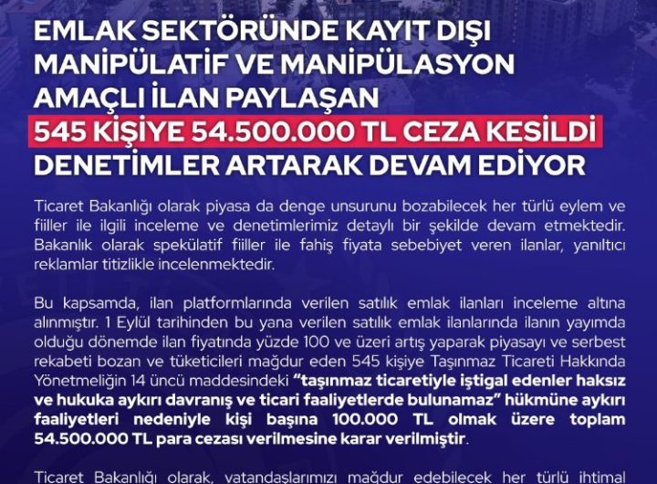 Emlak sektöründe kayıt dışı manipülatif ve manipülasyon amaçlı ilan paylaşan 545 kişiye 54 milyon 500 bin TL...
