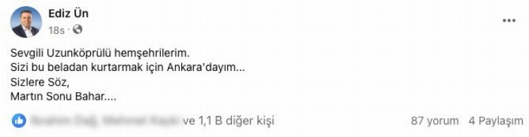 Erdoğan DEMİR / EDİRNE (İGFA) – CHP Edirne Milletvekili Ediz Ün, yaptığı paylaşımında “Sevgili Uzunköprülü hemşehrilerim. Sizi bu beladan kurtarmak için Anakara’dayım…Sizlere söz, Mart’ın sonu bahar” dedi.