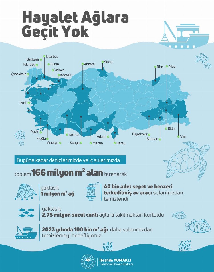 2014-2021 yılları arasında proje kapsamında İstanbul, Kocaeli, Tekirdağ, Yalova, Balıkesir, Çanakkale, Bursa, İzmir, Mersin, Hatay, Adana, Muğla, Aydın, Rize, Sinop, Konya, Isparta, Antalya ve Ankara’da deniz ve göllerde kaybolan veya terkedilen av araçları çıkarılarak, ekosistemin sürdürülebilirliği sağlandı. 2022 yılında ilk kez akarsularda da hayalet av araçlarının temizlenmesi çalışmalarının başlatıldığına vurgu yapan Tarım ve Orman Bakanı İbrahim Yumaklı, bu yıl sonuna kadar 100 bin metrekare hayalet ağı daha deniz, göl ve akarsulardan çıkarmayı hedeflediklerini kaydetti.