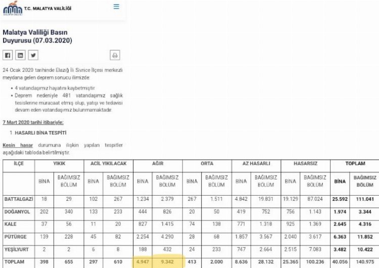 Malatya Valiliği’nin o tarihlerde açıkladığı rakamlar değişkenlik gösterir. Önce 7 bin binanın ağır hasarlı olduğu ifade edilir ama 2020’nin Mart ayında 4 bin 947 binanın ağır hasarlı olduğu açıklanır.