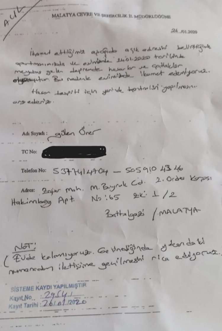 “İkamet ettiğimiz aşağıda açık adresini belirttiğimiz apartmanımızda ve dairemizde 24.01.2020 tarihinde meydana gelen depremde hasarlar ve çatlaklar oluşmuştur. Bu nedenle evimizde ikamet edemiyoruz. Hasar tespiti için yerinde testlerin yapılması için arz ederiz” diye yazmış Gülen Öner.