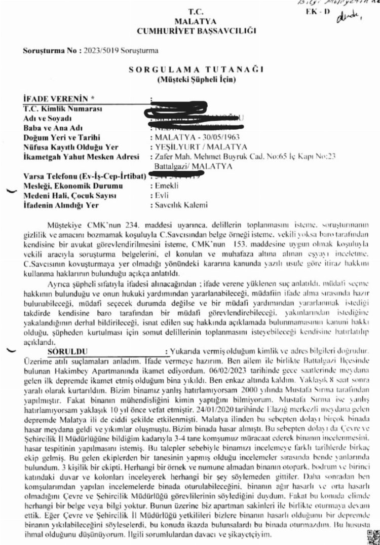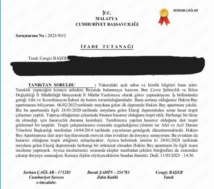 Cumhuriyet Savcısına verdiği ifadede, Sivrice depreminden sonra zemin katta bir dairenin kolonlarında çatlakların görüldüğünü, giriş kattaki merdivenlerde birkaç fayansın düştüğünü söylemiş. Ama Çevre ve Şehircilik İl Müdürlüğünün bu çatlakların sıva çatlağı olduğunu söylediğini de belirtmiş.