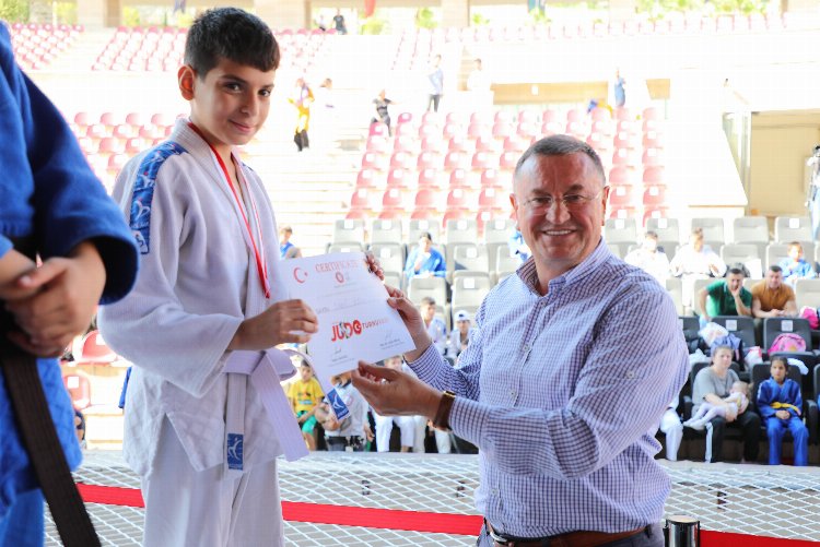 Başkan Savaş, müsabakada dereceye giren sporculara madalyalarını verirken Türkiye Judo Federasyonu Merkez Hakem Kurulu Başkanı Doğan Korkmaz’a da plaket takdim etti.