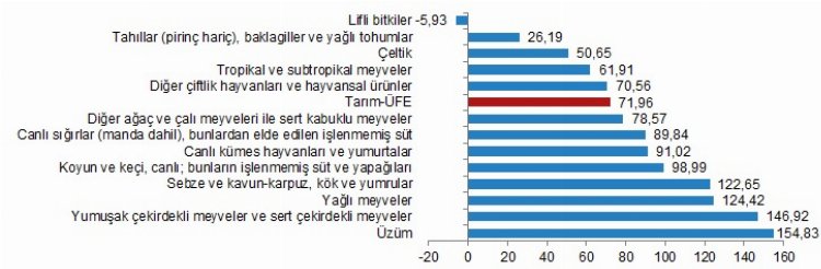 Yıllık artışın düşük olduğu alt gruplar sırasıyla, yüzde 26,19 ile tahıllar (pirinç hariç), baklagiller ve yağlı tohumlar ve yüzde 50,65 ile çeltik oldu. Buna karşılık, yıllık artışın yüksek olduğu alt gruplar ise sırasıyla, yüzde 154,83 ile üzüm ve yüzde 146,92 ile yumuşak çekirdekli meyveler ve sert çekirdekli meyveler oldu. Bir önceki yılın aynı ayına göre azalış gösteren tek alt grup ise yüzde 5,93 ile lifli bitkiler oldu.