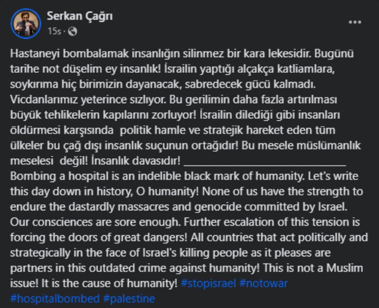 Erdoğan DEMİR / EDİRNE (İGFA) – Klarnet sanatçısı Serkan Çağrı paylaşımında, “Hastaneyi bombalamak insanlığın silinmez bir kara lekesidir. Bugünü tarihe not düşelim ey insanlık!” çağrısında bulundu.