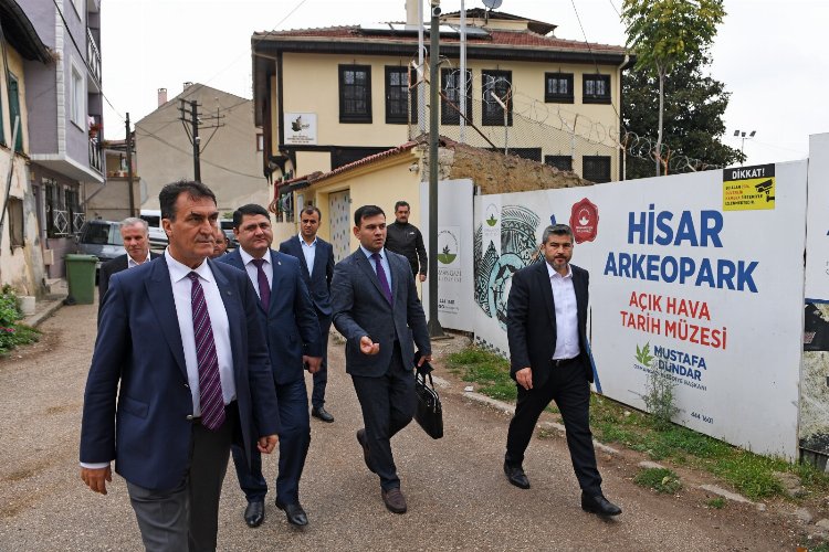 Başkan Dündar, Tacikistanlı heyete ilk önce Bursa’nın örnek projesi Osmangazi Meydanı’nı gezdirerek yakında açılışı yapılacak proje hakkında bilgi verdi. Daha sonra tüm dünyanın hayran kaldığı Panorama 1326 Bursa Fetih Müzesi’ni gezen heyet, sanal olarak gördükleri Eski Bursa’yı Hisar’da canlı olarak yaşadı. Başkan Dündar, misafirlerine Yaşayan Tarih Hisar İçi Projesi kapsamındaki Arkeopark, Filiboz Mescidi ve Oruçbey Caddesi’ni gezdirerek Bursa’nın tarihi hakkında bilgiler verdi. Üftade Türbesi çevre düzenleme çalışmalarını da yakından inceleyen Tacik heyet, Tarihi Çarşı ve Hanlar Bölgesi’ni de ziyaret etme fırsatı buldu.