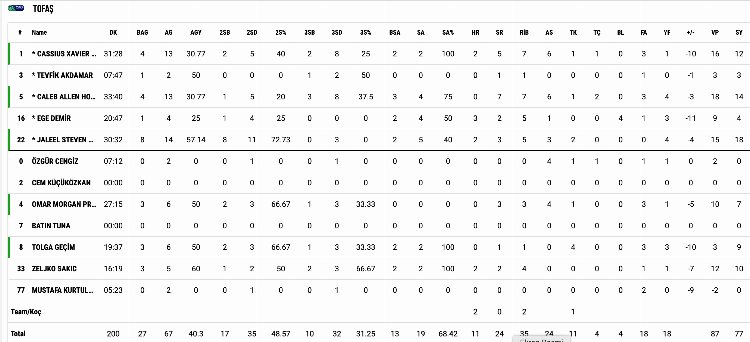 Manisa Büyükşehir Belediyespor karşısında TOFAŞ’ta J.J. O’Brien 18 sayı; Caleb Homesley 14 sayı; Cassius Winston 12 sayı; Zeljko Sakic 10 sayıyla oynarken; Austin Wiley sakatlığı, Luke Maye de yabancı kontenjanı nedeniyle forma giymedi.