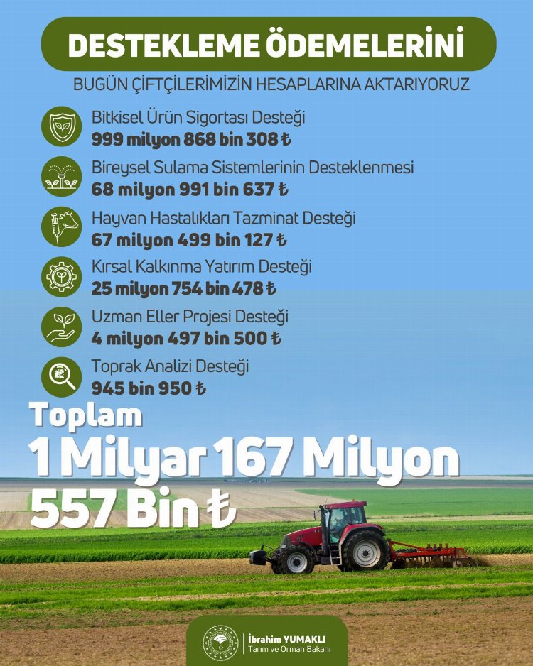 Tarım ve Orman Bakanı İbrahim Yumaklı, 1 milyar 167 milyon 557 bin TL tarımsal destekleme ödemesinin bugün çiftçilerin hesaplarına aktaracaklarını açıkladı.