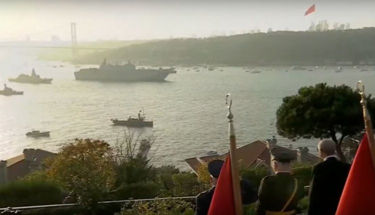 Başta TCG Anadolu olmak üzere 100 gemi Boğaz’dan giriş yapmaya başladı. İstanbul Boğazı’nda yapılan bu törenin donanma tarihindeki en büyük geçit töreni olduğu açıklandı.