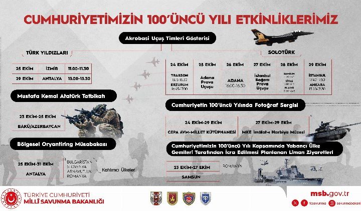 Türkiye Cumhuriyeti’nin 100’üncü yılının kutlanacağı 29 Ekim Cumhuriyet Bayramı haftasında Millî Savunma Bakanlığı (MSB) olarak birçok etkinliği...