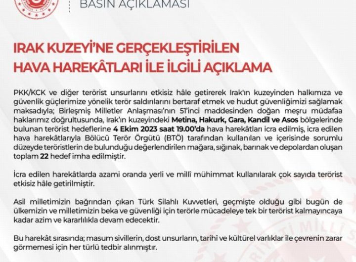 Milli Savunma Bakanlığı, Irak’ın kuzeyine düzenlenen hava harekatında 22 hedefi daha imha ederken, çok sayıda teröristin etkisiz...