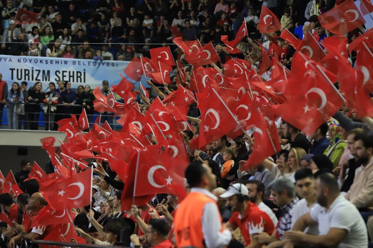 Serdivan Spor Salonu’nda oynanan mücadeleye Sakaryalılar akın etti. Türk bayraklarıyla görsel şölen oluşturan Sakaryalı sporseverler Milli takıma büyük destek verdi.