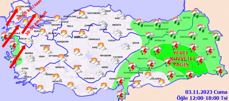 KUVVETLİ RÜZGAR UYARISI : Rüzgarın; Marmara, Kuzey Ege ve Kıyı Ege’de güney yönlerden kuvvetli (40-60 km/saat) yer yer kısa süreli fırtına (60-70 km/saat) şeklinde esmesi beklendiğinden meydana gelebilecek olumsuzluklara karşı dikkatli ve tedbirli olunmalıdır.