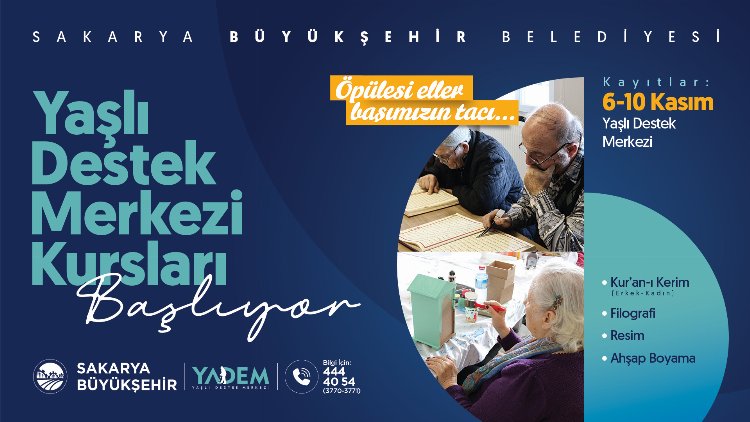 Sakarya Büyükşehir Yaşlı Destek Merkezi’nin (YADEM) yeni dönem kurslarına kayıtlar başlıyor. Kur’an-ı Kerim, filografi, resim ve ahşap boyama kursları için kayıtlar 6 -10 Kasım tarihleri arasında YADM’de yüz yüze yapılacak. Büyükşehir yetkilileri tüm Sakaryalı vatandaşlara katılım çağrısı yaptı.