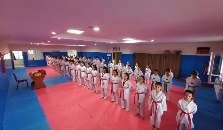 Bilecik Bozüyük’te Güneşspor Kulübü ile Halk Eğitim Merkezi’nin ortak açtığı taekwondo kursuna katılan sporcular kuşak terfi heyecanı...