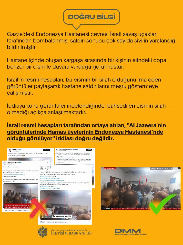 İletişim Başkanlığı bünyesindeki Dezenformasyonla Mücadele Merkezi tarafından yapılan açıklamada, Gazze’deki Endonezya Hastanesi çevresi İsrail savaş uçakları tarafından bombalanmış, saldırı sonucu sivillerin yaralandığı bildirildiğine dikkati çekilerek, “Hastane içinde oluşan kargaşa sırasında bir kişinin elindeki copa benzer bir cisimle duvara vurduğu görülmüştür. İsrail’in resmi hesapları, bu cismin bir silah olduğunu ima eden görüntüler paylaşarak hastane saldırılarını meşru göstermeye çalışmıştır. İddiaya konu görüntüler incelendiğinde, bahsedilen cismin silah olmadığı açıkça anlaşılmaktadır” ifadeleri yer aldı.