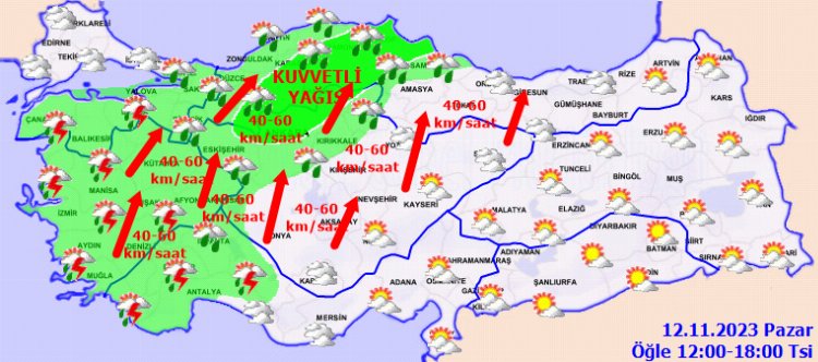 Sağanak ve gök gürültülü yağışların; Batı Karadeniz bölge geneli, Bursa, Yalova, Kocaeli, Sakarya, Ankara, Çankırı, İzmir, Manisa, Aydın ve Muğla çevreleri ile Antalya’nın doğusunda yerel kuvvetli olacağı tahmin ediliyor.