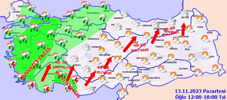 KUVVETLİ RÜZGAR UYARISI: Rüzgarın, Marmara’nın kuzeyi ile Batı ve Orta Karadeniz kıyılarında kuzeyli, Batı Akdeniz’in iç kesimleri, İç Anadolu’nun güney ve doğusu, Doğu Karadeniz’in iç kesimleri ile Doğu Anadolu’nun kuzeyinde güneyli yönlerden kuvvetli olarak (40-60 km/saat) esmesi beklendiğinden meydana gelebilecek olumsuzluklara karşı dikkatli ve tedbirli olunmalıdır.