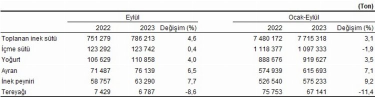 Eylül ayında bir önceki yılın aynı ayına göre, inek peyniri üretimi yüzde 7,7, ayran üretimi yüzde 6,5, yoğurt üretimi yüzde 4,0 ve içme sütü üretimi yüzde 0,4 artarken; tereyağı üretimi yüzde 8,6 azaldı. Ocak-Eylül döneminde ise bir önceki yılın aynı dönemine göre, inek peyniri üretimi yüzde 9,2, ayran üretimi yüzde 7,1 ve yoğurt üretimi %3,5 artarken; tereyağı üretimi ,4 ve içme sütü üretimi yüzde 1,9 azaldı.