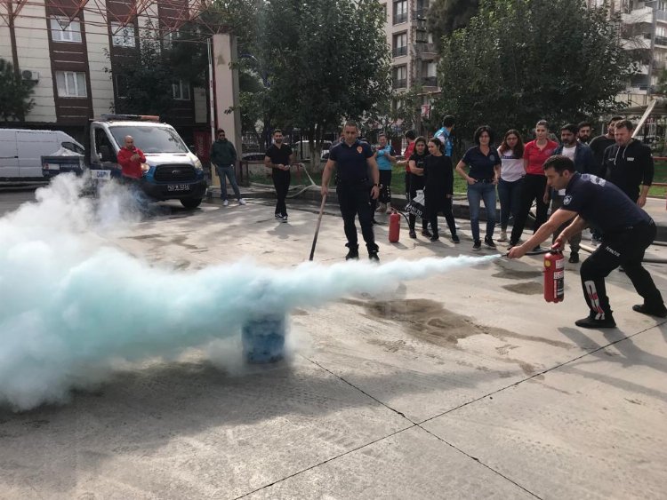 Eğitim alan Manisa UMKE sağlık personelleri, yangına karşı ilk müdahaleyi ve yangını söndürmeyi uygulamalı olarak öğrendi.