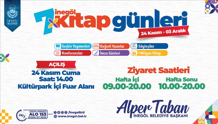 İnegöl Belediyesinin gerçekleştirdiği 7’nci Kitap Günlerinin başladığını hatırlatan Başkan Taban, “İnegöl’ümüzde de 24 Kasım Cuma günü Öğretmenler Gününde başlayıp 03 Aralık tarihine kadar sürecek bir kitap şöleni olacak. 24 Kasım Cuma günü 14.00’da MODEF Fuar alanında açılışımızı gerçekleştireceğiz. Açılışımızın onu konuğu Yazar İhsan Süreyya Sırma olacak. Organizasyon boyunca da çok kıymetli yazarlarımızı misafir edeceğiz. Bunlardan birkaçını saymak gerekirse; Hayati İnanç, Gri Koç, Orhan Toker, Merve Gülcemal, Tufan Gündüz, Kemal Sayar, Fatih Duman, Hatice Kübra Tongar, Nurullah Genç, Dilek Cesur ve Beyhan Budak. Fuarımızın bu yılki sloganı ise İnegöl’de mevsim kitap şeklinde belirlendi. Hafta içi 09.00-20.00 hafta sonu ise 10.00-20.00 saatleri arasında açık kalacak Kitap Günleri Fuarımızda, 100’ü aşkın yazar ve yayınevi ile 1 milyonu aşkın kitabı ilçe halkımızla buluşturacağız.” diye konuştu.
