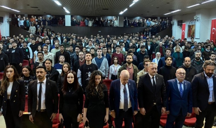 BURSA (İGFA) – Salonun tamamını dolduran gençlerin dışında ayakta kalan birçok genç Prof. Dr. Ümit Özdağ’ın teklifi ile koltuk aralarında koridorlara oturdu.