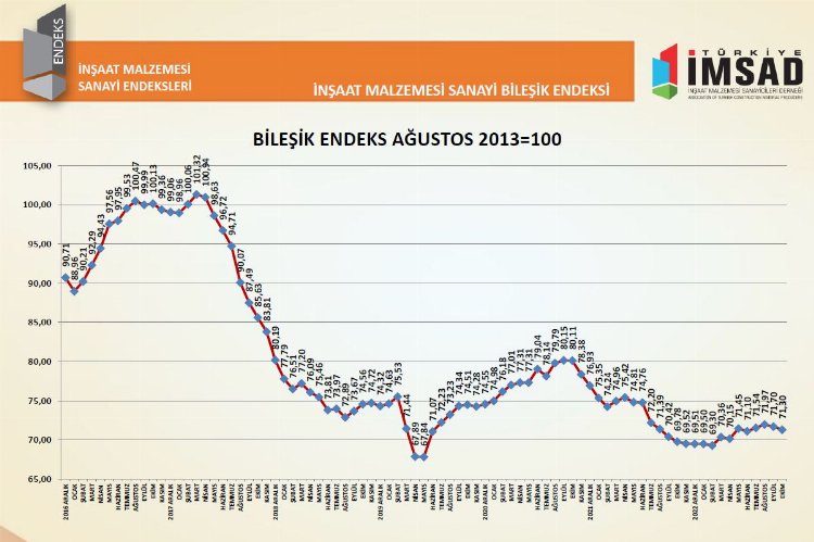 Türkiye İMSAD tarafından hazırlanan İnşaat Malzemesi Sanayi Bileşik Endeksi Ekim 2023 sonuçları açıklandı. Bileşik Endeks, eylül ayındaki düşüşün ardından ekim ayında da 0,40 puanlık gerilemeyle 71,30 puana indi.
