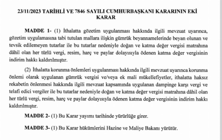 ANKARA (İGFA) – İthalatta Gözetim ve Korunma Önlemi Uygulamaları Kapsamında Hesaplanan Katma Değer Vergisinin İndirim Hakkının Kaldırılmasına Dair Cumhurbaşkanı kararı bugünkü Resmi Gazete’de yayımlandı.