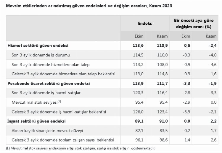 Buna göre, mevsim etkilerinden arındırılmış güven endeksi Kasım ayında bir önceki aya göre; hizmet sektöründe yüzde 2,4 oranında azalarak 110,9 değerini, perakende ticaret sektöründe yüzde 1,9 oranında azalarak 111,7 değerini ve inşaat sektöründe yüzde 2,2 oranında artarak 91,0 değerini aldı.