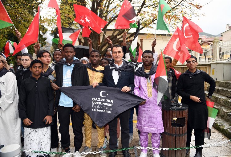 BURSA (İGFA) – 89 ülkeden 155 yabancı öğrencinin eğitim gördüğü Osmangazi Belediyesi Uluslararası Murat Hüdavendigar Anadolu İmam Hatip Lisesi öğrencileri, yöresel kıyafetleri ile birlikte Osmangazi Türbesi önünde İsrail’in Gazzeli masum ve mazlumlara yönelik katliam ve soykırımına karşı tek başına dünyaya meydan okuyan Cumhurbaşkanı Erdoğan’ın zulme karşı ümmet olma çağrısını dünyaya haykırdı.