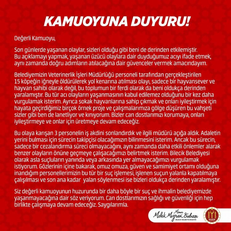 Bu arada Bilecik Belediye Başkanı Melek Mızrak Subaşı da yaptığı yazılı açıklamada, Veterinerlik İşleri Müdürlüğü personeli tarafından gerçekleştirilen 15 köpeğin iğneyle öldürülerek yol kenarına atılması olayının sadece bir hayvansever ve hayvan sahibi olarak değil, toplumun bir ferdi olarak kendisini de oldukça derinden yaraladığını belirtti. Olayın kabul edilemez olduğunu vurgulayan Başkan Subaşı, “Sokak hayvanlarına sahip çıkmak ve onları iyileştirmek için hayata geçirdiğimiz birçok örnek proje ve çalışmalarımıza gölge düşüren bu vahşeti sizler gibi ben de lanetliyor ve kınıyorum. Bu olaya karışan 3 personelin iş akdini sonlandırdık ve ilgili müdürü açığa aldık. Adaletin yerini bulması için sürecin takipçisi olacağımızın bilinmesini isterim. Bilecik Belediyesi olarak asla suçluların yanında veya arkasında yer almayacağımızı vurgulamak istiyorum. Gözlerinin içine bakarak, omuz omuza, güven ve samimiyet ortamı olduğuna inandığım personellerimizin bu tür bir suç işlemesi, işlenen suçun yalanla kapatılmaya çalışılması ve son ana kadar yalan söylenmesi ise bizleri oldukça derinden yaralamıştır” ifadelerini kullandı.