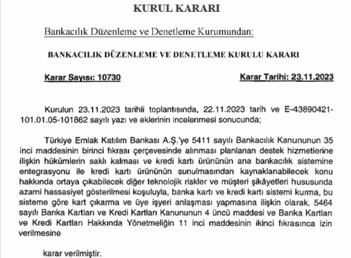Bankacılık Düzenleme ve Denetleme Kurumu (BDDK)’dan Türkiye Emlak Katılım Bankası için kredi ve banka kartı izni verildi....