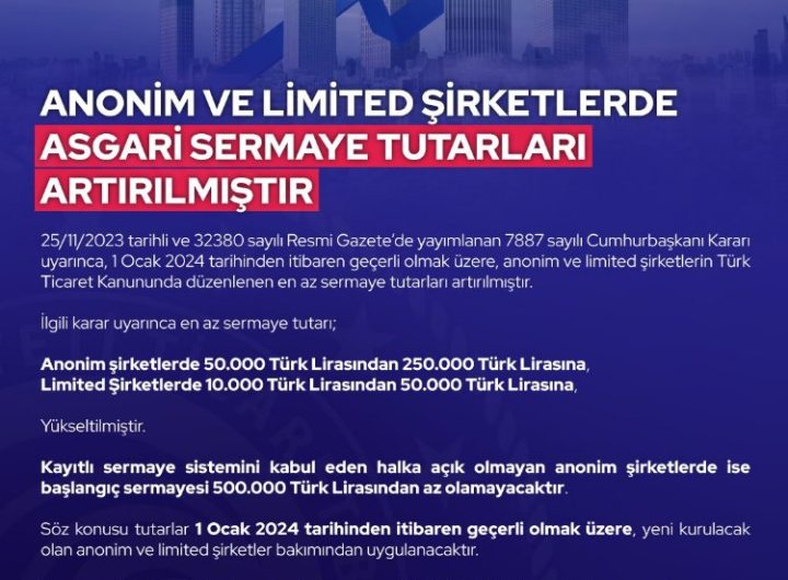 Ticaret Bakanlığı, Anonim ve Limited şirketlerde asgari sermaye tutarlarının 1 Ocak 2024 tarihi itibariyle arttırıldığını duyurdu. ANKARA...