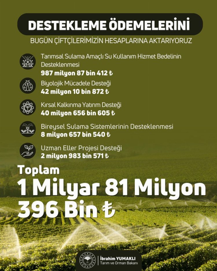ANKARA (İGFA) – Tarım ve Orman Bakanı İbrahim Yumaklı, sosyal medya hesabından yaptığı paylaşımda, 1 milyar 81 milyon 396 bin TL tarımsal destekleme ödemelerinin bugün itibariyle çiftçilerimizin hesaplarına aktarılmaya başlandığını duyurdu.