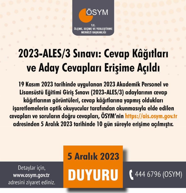 ÖSYM, 2023 Akademik Personel ve Lisansüstü Eğitimi Giriş Sınavı (2023-ALES/3) sonuçlarını açıkladı.