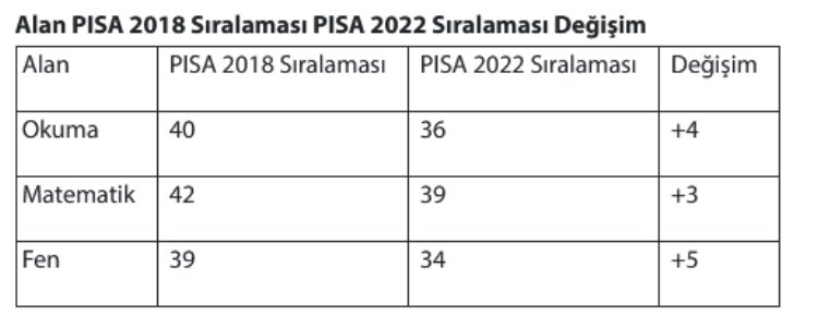 Ölçme, Değerlendirme ve Sınav Hizmetleri Genel Müdürlüğünün raporuna göre, Türkiye PISA 2022 sonuçlarında, matematik alanında 2018 ile hemen hemen aynı puanı alırken, fen okuryazarlığı alanında daha yüksek puan elde etti, okuma becerilerinde ise daha düşük performans gösterdi.