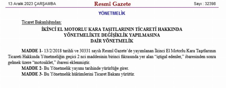Bugünkü Resmi Gazete’de yayımlanan karara göre ikinci el taşıt satışında uygulanan 6 ay ve 6 bin kilometre sınırlamasına motosiklet satışları da dahil edildi.