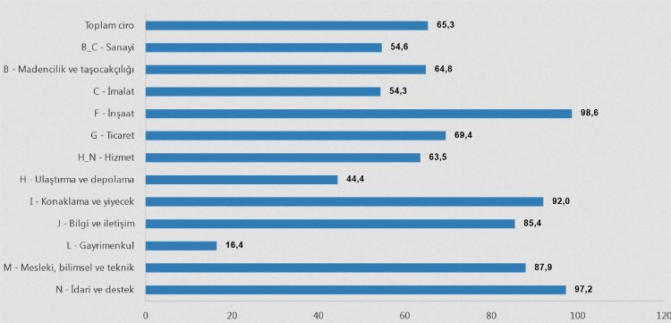 Ekim ayında yıllık yüzde 65,3 oranında artış gösteren toplam cironun alt detaylarına bakıldığında; 2023 yılı Ekim ayında yıllık sanayi sektörü ciro endeksi yüzde 54,6 arttı, inşaat ciro endeksi yüzde 98,6 arttı, ticaret ciro endeksi yüzde 69,4 artarken, hizmet ciro endeksi yüzde 63,5 arttı.
