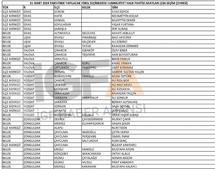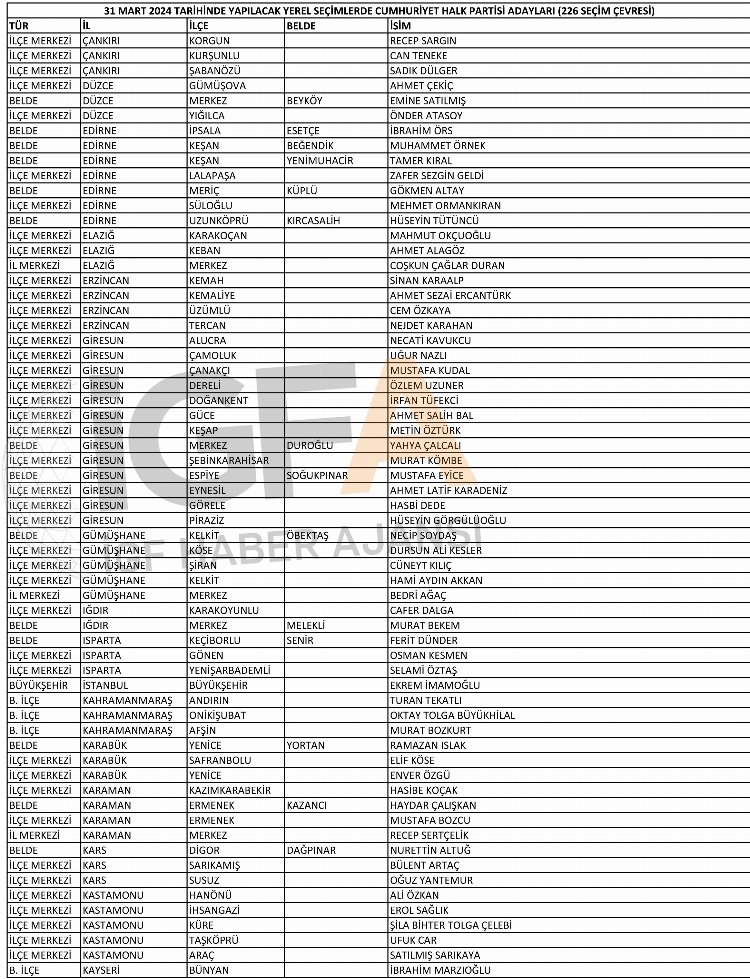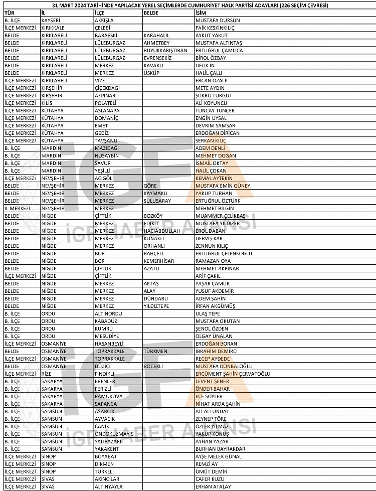 İşte CHP’nin belli olan 227 belediye başkan adayının tam listesi: