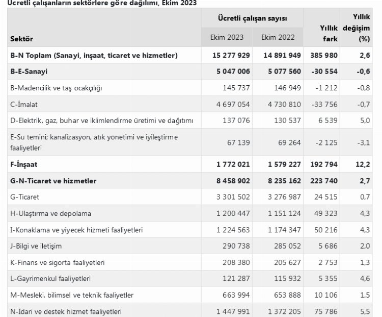 Sanayi, inşaat ve ticaret-hizmet sektörleri toplamında ücretli çalışan sayısı 2023 Ekim ayında bir önceki yılın aynı ayına göre yüzde 2,6 arttı. Ücretli çalışan sayısı bir önceki yılın aynı ayında 14 milyon 891 bin 949 kişi iken, 2023 yılı Ekim ayında 15 milyon 277 bin 929 kişi oldu.