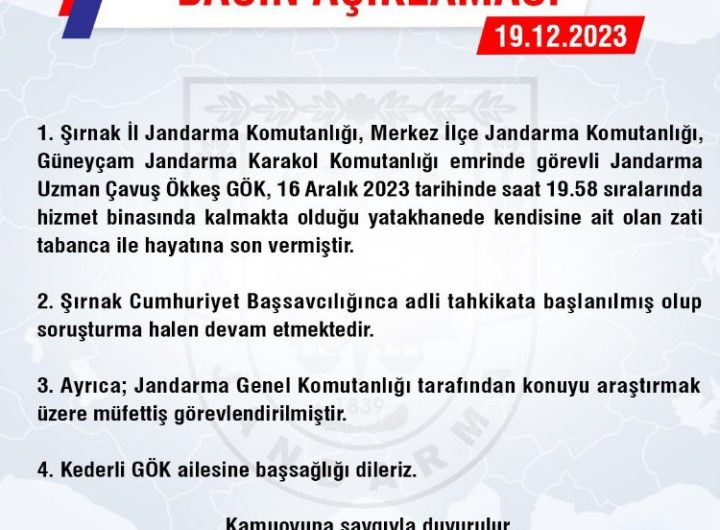 Şırnak’ta görevli Jandarma Uzman Çavuş Ökkeş Gök’ün yatakhanede kendi tabancasıyla hayatına son vermesine ilişkin soruşturma sürüyor. ANKARA...