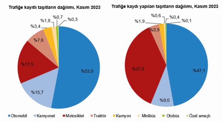 Kasım ayında trafiğe kaydı yapılan taşıtların yüzde 47,1’ini otomobil, yüzde 37,0’ını motosiklet, yüzde 9,0’ını kamyonet, yüzde 3,9’unu traktör, yüzde 1,9’unu kamyon, yüzde 0,6’sını minibüs, yüzde 0,4’ünü otobüs ve yüzde 0,1’ini özel amaçlı taşıtlar oluşturdu.