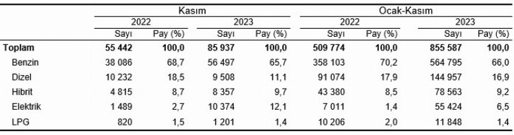 Kasım ayında geçen yılın aynı ayına göre trafiğe kaydı yapılan taşıt sayısı ise, motosiklette yüzde 82,0, minibüste yüzde 64,5, otomobilde yüzde 55,0, otobüste yüzde 45,7 artarken özel amaçlı taşıtta yüzde 18,1, traktörde yüzde 8,7, kamyonette yüzde 7,1 ve kamyonda yüzde 2,9 azaldı.