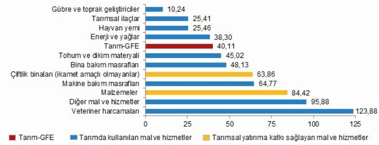 Bir önceki yılın aynı ayına göre artışın düşük olduğu alt gruplar yüzde 10,24 ile gübre ve toprak geliştiriciler ve yüzde 25,41 ile tarımsal ilaçlar olurken, yıllık artışın yüksek olduğu alt gruplar ise sırasıyla, yüzde 123,88 ile veteriner harcamaları ve yüzde 95,88 ile diğer mal ve hizmetler oldu.