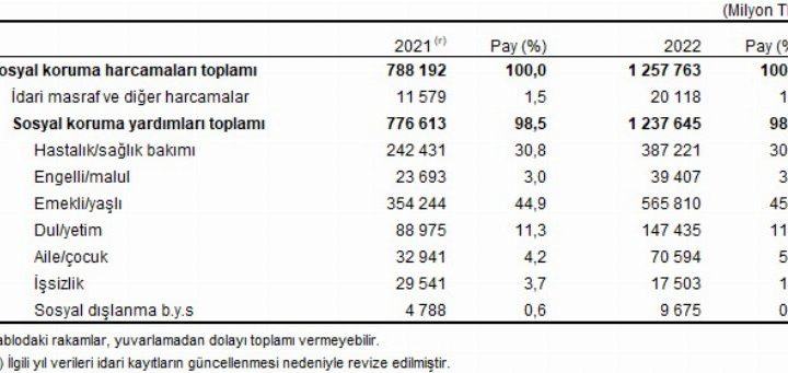 TÜİK’in 2022 yılına ilişkin yayımladığı Sosyal Koruma İstatistikleri verilerine göre, sosyal koruma harcamaları bir önceki yıla göre...