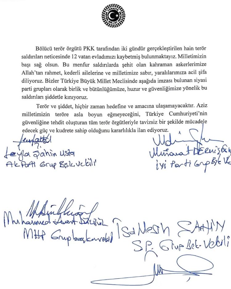“Bölücü terör örgütü PKK tarafından iki gündür gerçekleştirilen hain terör saldırıları neticesinde 12 vatan evladımızı kaybetmiş bulunmaktayız. Milletimizin başı sağ olsun. Bu menfur saldırılarda şehit düşen kahraman askerlerimize Cenabıallah’tan rahmet, kederli ailelerine ve milletimize sabır, yaralılarımıza acil şifa diliyoruz. Bizler, TBMM’de, bildiride imzası bulunan siyasi parti grupları olarak, birlik ve bütünlüğümüze, huzur ve güvenliğimize yönelik bu saldırıları şiddetle kınıyoruz. Terör ve şiddet hiçbir zaman hedefine ve amacına ulaşamayacaktır. Aziz milletimizin teröre asla boyun eğmeyeceğini, Türkiye Cumhuriyeti’nin güvenliğine tehdit oluşturan tüm terör örgütleriyle tavizsiz bir şekilde mücadele edecek güç ve kudrete sahip olduğunu kararlılıkla ilan ediyoruz.”